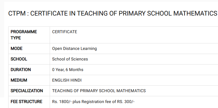 Certification Teaching of Primary School Mathematic at IGNOU is a 6 months, Part Time Certification program offered Distance.