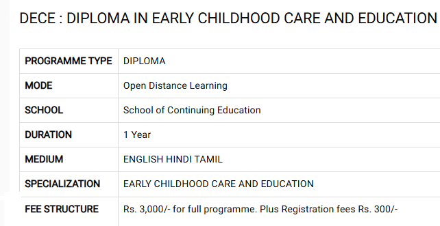 Diploma Early Childhood Education at IGNOU is a 1 year , Part Time Diploma program offered Distance.