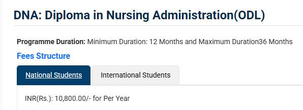 IGNOU Diploma Nursing Administration fees 2025 is ₹ 10,800 for the entire course duration.