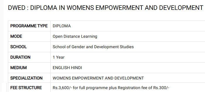 Find detailed IGNOU Diploma Women Empowerment and Development fees, eligibility, admission dates, cutoff and ranking below.