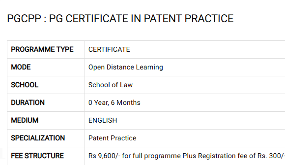 IGNOU PG Certification Patent Practice is offered as 6 Months Part Time program. The minimum eligibility criteria for PG Certification is Graduation. The total fees for IGNOU PG Certification Patent Practice in 2025 is ₹ 9,900 for the complete course duration.