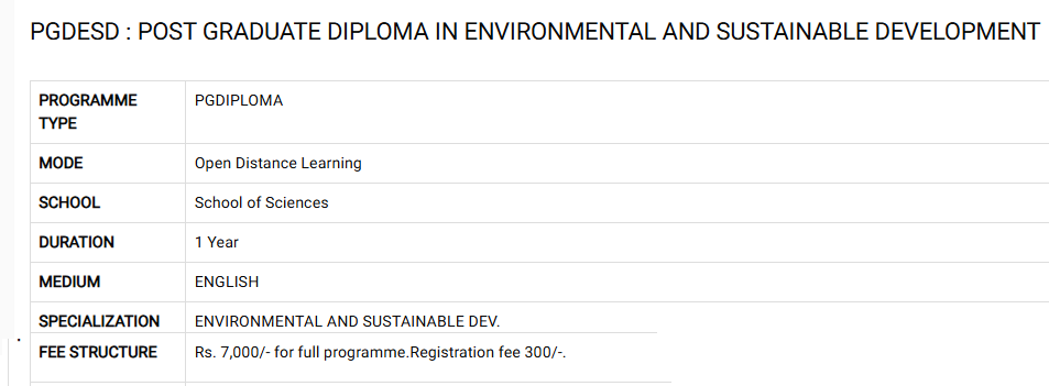 Find detailed IGNOU PG Diploma Environment And Sustainable Development fees, eligibility, admission dates, cutoff and ranking below.