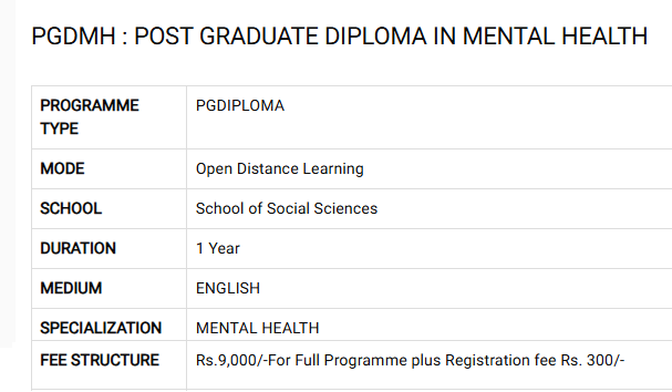 IGNOU PG Diploma Mental Health Care fees 2025 is ₹ 12,500 for the entire course duration.