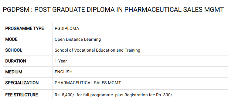 Find detailed IGNOU PG Diploma Pharmaceutical Sales Management fees, eligibility, admission dates, cutoff and ranking below.