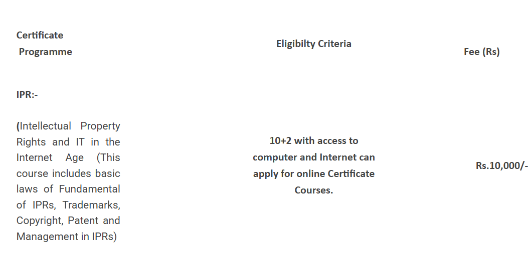 Indian Law Institute New Delhi Certification Intellectual Property is offered as 3 Months Full Time program, with total intake of 150 seats. The minimum eligibility criteria for Certification is 10+2. The total fees for Indian Law Institute New Delhi Certification Intellectual Property in 2025 is ₹ 10,000 for the complete course duration.
