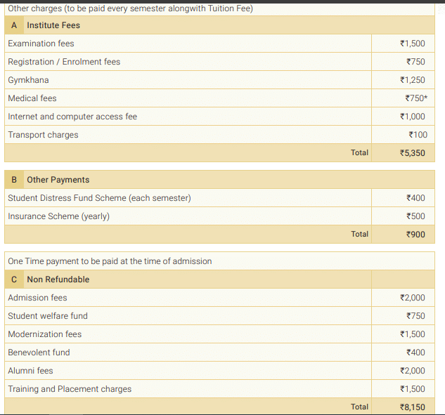 | Semester Wise Fees | ₹29900 | ₹13250 | ₹13750 | ₹13250 | ₹13750 | ₹13250 |