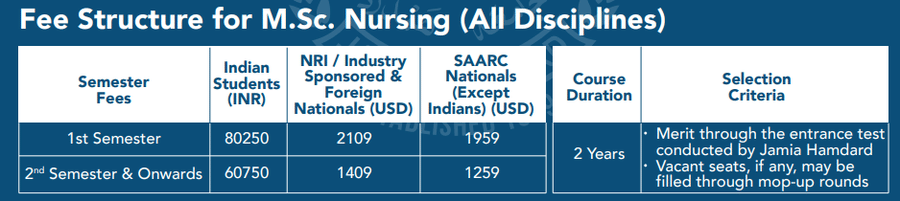 Earlier, M.Sc Child Health Nursing fees at Jamia Hamdard University Delhi was ₹ 2.6 Lakhs (in 2024) for the entire course duration. This shows that the fee has remained unchanged since 2024.