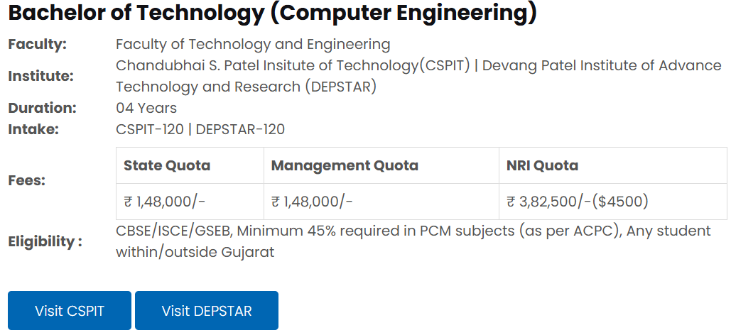 Charusat University offers admissions through management quota, government portal ACPC, or NRI quota, requiring additional fees. For computer engineering, an ACPC rank under 5000 is generally needed. The annual engineering fee is Rs. 121,000, split into two installments of Rs. 60,500 per semester, with an additional Rs. 2,000 exam fee per semester. NRI students pay Rs. 150,000 per semester. Scholarships like MYSY offer a 50% fee waiver for eligible students, alongside other merit-based scholarships.