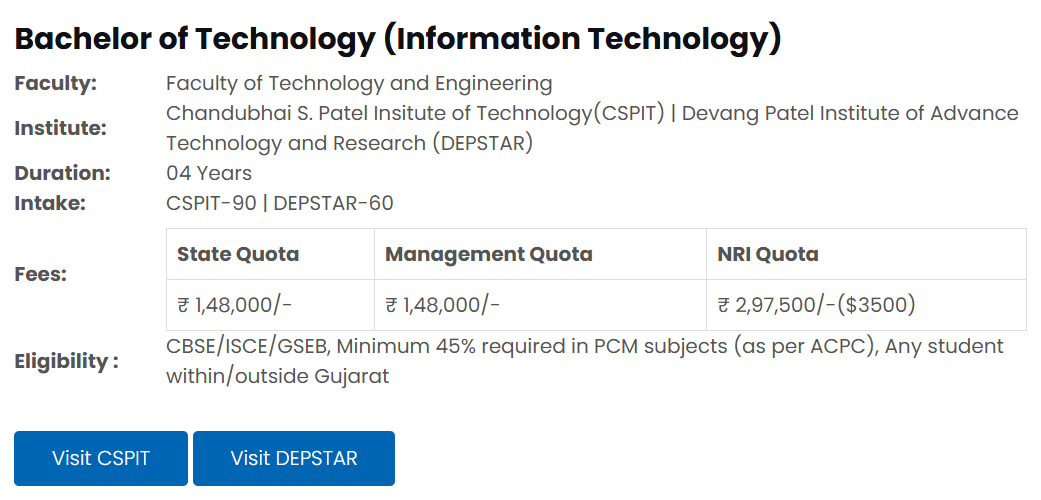 The annual tuition fee ranges from 98,000 to 1,29,000 INR, with semester costs around 58,000 INR. NRI students pay approximately 2 lakh INR. Scholarships aid financially, with merit-based awards and government support like the Mukhyamantri Yuva Swavalamban Yojana. CHARUSAT has a strong placement record, with nearly 100% of students securing jobs. The average placement package is between 4 to 6 LPA, with the highest reaching 35 LPA, offered by companies like Amazon.