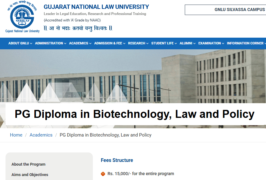 GNLU Gandhinagar PG Diploma Biotechnology fees 2025 is ₹ 15,000 for the entire course duration.