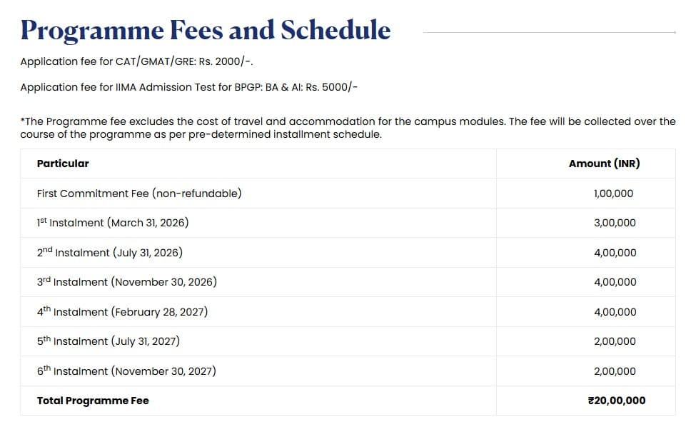 03 Dec, 2025 IIM Ahmedabad Fee Structure 2026 for MBA-BPGP: BA & AI program has been released. The total academic fee is ₹ 20 Lakhs.