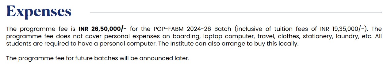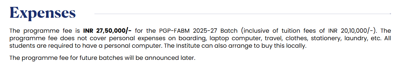 The total cost of the 2-year PGP-FABM program (2025–27 batch) is INR 27,50,000. This includes tuition fees of INR 20,10,000, with the remaining covering other institute-related charges.