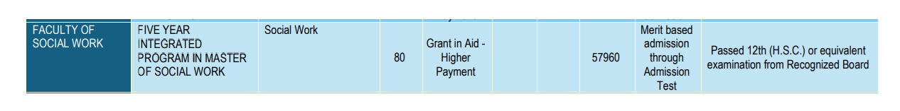 MSU Baroda offers a total of 80 seats for BSW + MSW . Candidates must have at least 10+2 to be eligible for admissions. Check MSU Baroda Admission 2025