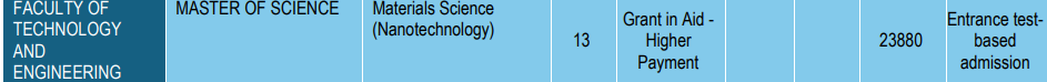 M.Sc Energy And Material Sciences at MSU Baroda is a 2 Years Degree. The course is offered On Campus as a Full Time program. MSU Baroda M.Sc Energy And Material Sciences First Year Fees is INR 23,880 for 2024.