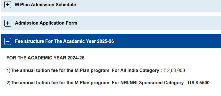 Nirma University Ahmedabad M.Plan is offered as 2 Years Full Time program, with total intake of 40 seats. The minimum eligibility criteria for M.Plan is Graduation+Entrance Exam &Interview. The total fees for Nirma University Ahmedabad M.Plan in 2025 is ₹ 5.6 Lakhs for the complete course duration, which includes total tuition fees of ₹ 5.6 Lakhs.