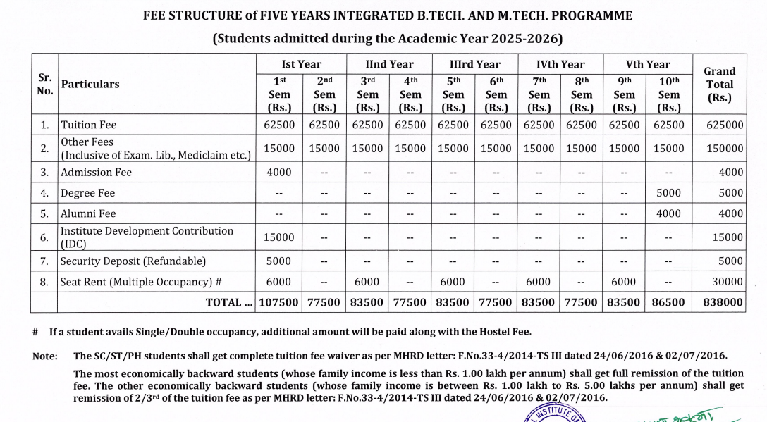 The admission fee per semester is around 7,500 INR, and the development fee is about 15,000 INR per year. General student semester fees average 80,000 INR, including 62,500 INR for tuition, while SC, ST, and EWS students often benefit from full fee remissions. Scholarships are widely accessible, enhancing affordability for many students.