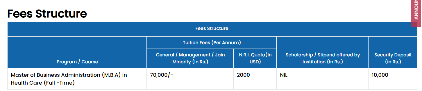 Sumandeep Vidyapeeth Vadodara MBA Health Care Management fees in first year is ₹ 80,000. The detailed fees is mentioned below.Sumandeep Vidyapeeth Vadodara Hostel Fee for Male is ₹ 25,000 to 1.6 Lakhs. Hostel Fee for Female at Sumandeep Vidyapeeth Vadodara is ₹ 25,000 to 1.25 Lakhs.