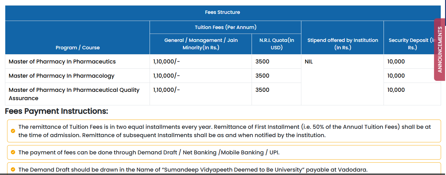 Sumandeep Vidyapeeth Vadodara M.Pharm Pharmaceutics fees in first year is ₹ 1.2 Lakhs. The detailed fees is mentioned below.Sumandeep Vidyapeeth Vadodara Hostel Fee for Male is ₹ 25,000 to 1.6 Lakhs. Hostel Fee for Female at Sumandeep Vidyapeeth Vadodara is ₹ 25,000 to 1.25 Lakhs.