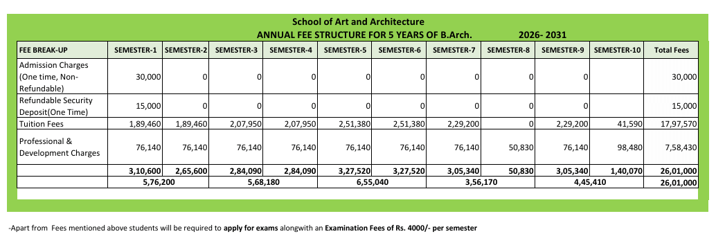 Earlier, B.Arch fees at Sushant University was ₹ 26.36 Lakhs (in 2025) for the entire course duration. This shows a fee increase of ₹ 4,550 over the year.