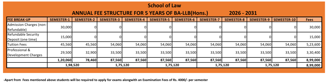 Earlier, BALLB {Hons.} fees at Sushant University was ₹ 9.34 Lakhs (in 2025) for the entire course duration. This shows a fee increase of ₹ 5,000 over the year.