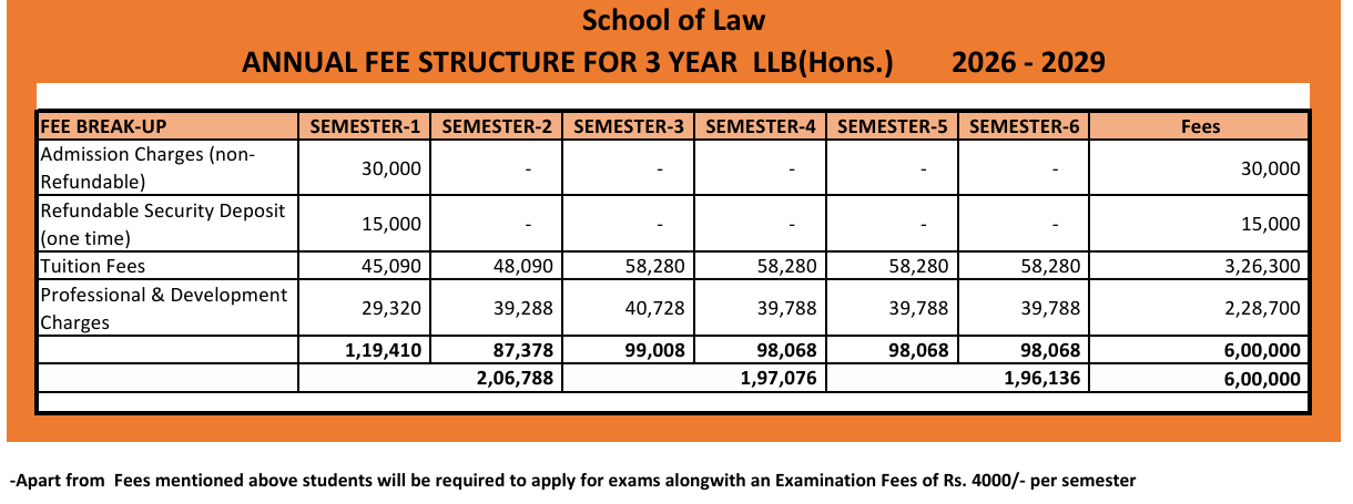 Earlier, L.L.B {Hons.} fees at Sushant University was ₹ 5.69 Lakhs (in 2025) for the entire course duration. This shows a fee increase of ₹ 10,392 over the year.