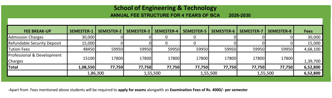 Earlier, BCA {Hons.} fees at Sushant University was ₹ 6.81 Lakhs (in 2025) for the entire course duration. This shows a fee increase of ₹ 4,000 over the year.