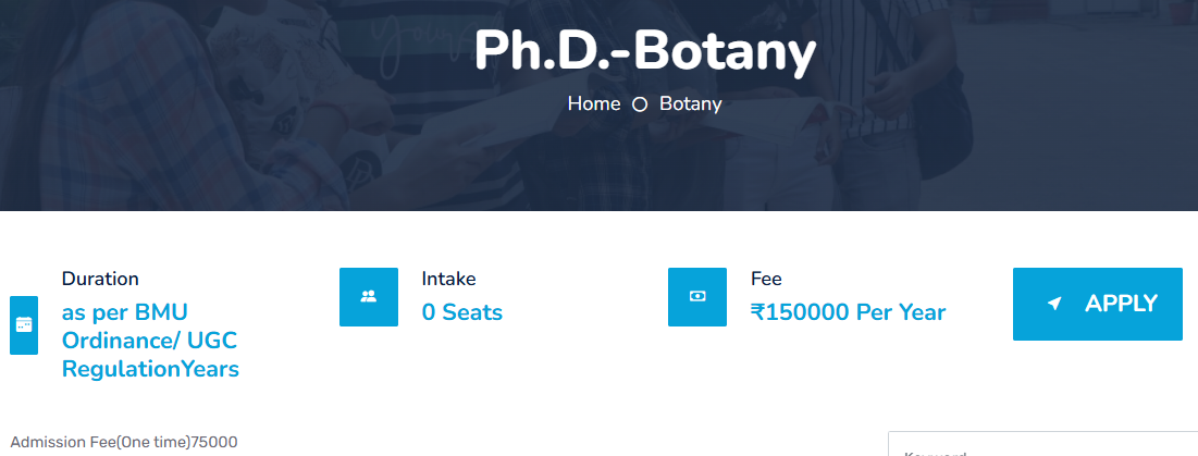 Baba MastNath University Rohtak Ph.D Botany is offered as 3 Years Full Time program. The minimum eligibility criteria for Ph.D is Post Graduation. The total fees for Baba MastNath University Rohtak Ph.D Botany in 2025 is ₹ 4.75 Lakhs for the complete course duration, which includes total tuition fees of ₹ 4.5 Lakhs. Earlier, the fees in 2024 - 2025 for Ph.D Botany was ₹ 7.75 Lakhs.