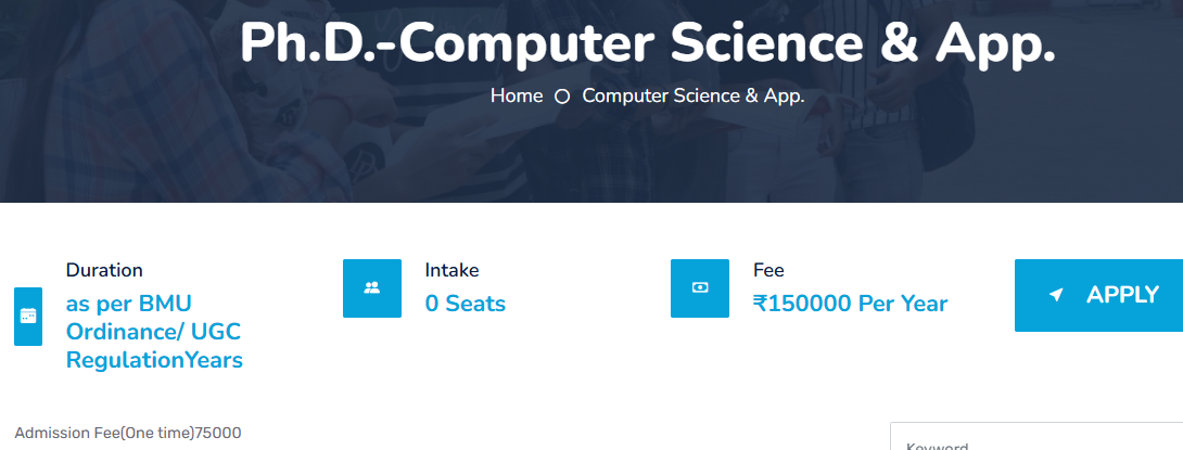 Baba MastNath University Rohtak Ph.D Computer Science And Applications is offered as 3 Years Full Time program. The minimum eligibility criteria for Ph.D is Post Graduation. The total fees for Baba MastNath University Rohtak Ph.D Computer Science And Applications in 2025 is ₹ 5.25 Lakhs for the complete course duration, which includes total tuition fees of ₹ 4.5 Lakhs.