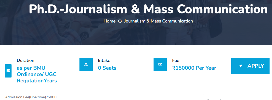 Baba MastNath University Rohtak Ph.D Journalism And Mass Communication is offered as 3 Years Full Time program. The minimum eligibility criteria for Ph.D is Post Graduation. The total fees for Baba MastNath University Rohtak Ph.D Journalism And Mass Communication in 2025 is ₹ 4.25 Lakhs for the complete course duration, which includes total tuition fees of ₹ 4.5 Lakhs. Earlier, the fees in 2022 - 2023 for Ph.D Journalism And Mass Communication was ₹ 3 Lakhs.