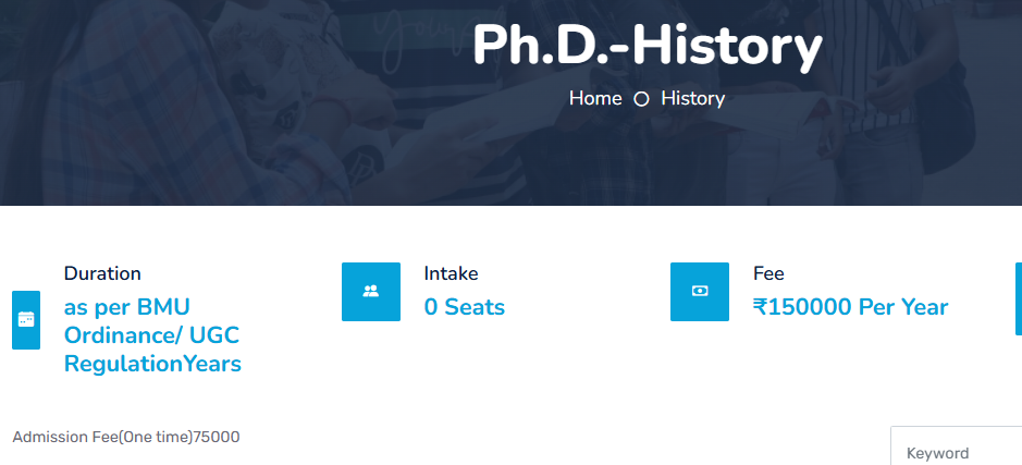 Baba MastNath University Rohtak Ph.D History is offered as 3 Years Full Time program. The minimum eligibility criteria for Ph.D is Post Graduation. The total fees for Baba MastNath University Rohtak Ph.D History in 2025 is ₹ 5.25 Lakhs for the complete course duration, which includes total tuition fees of ₹ 4.5 Lakhs. Earlier, the fees in 2024 - 2025 for Ph.D History was ₹ 7.75 Lakhs.