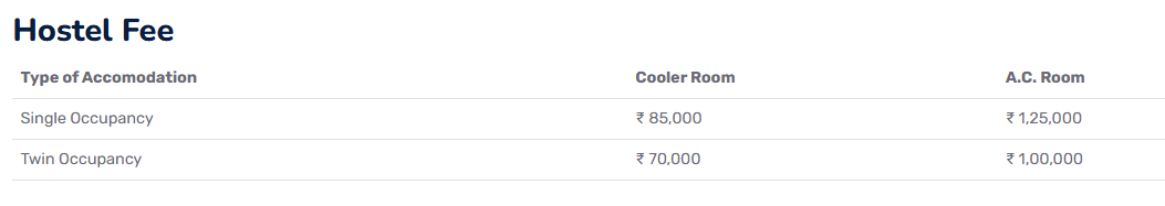 The hostel offers separate facilities for boys and girls, with central air conditioning available. Rooms are spacious, airy, and well-maintained, each equipped with separate beds, almirahs, study tables, and chairs. The hostel ensures 24/7 electricity and water supply, including R.O. water and hot water in winters. The annual fees range between INR 60,000 to 80,000, depending on room sharing preferences.
