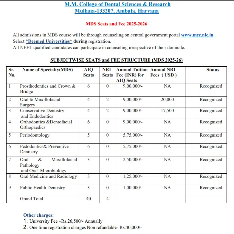 For students applying under the NRI quota for admission, the total course fee for MDS Oral & Maxillofacial Surgery at MM University Ambala is ₹ 52.57 Lakhs.