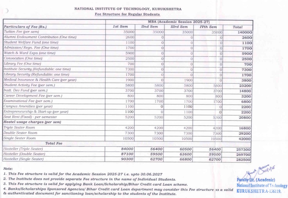 Earlier, MBA International Business fees at NIT Kurukshetra was ₹ 2.36 Lakhs (in 2024) for the entire course duration. This shows a fee increase of ₹ 4,900 over the year.