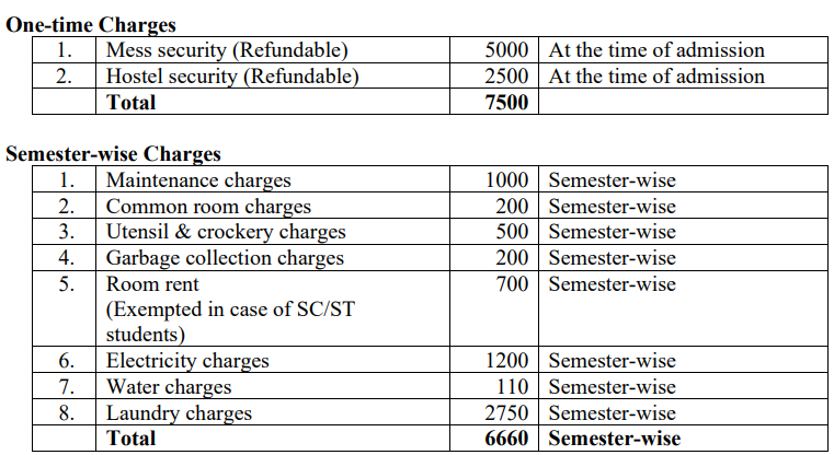 The hostel offers well-equipped facilities with rooms allocated based on academic level: BSc students share rooms with 3 occupants, MSc and MBA students with 2, while PhD students have single occupancy. Monthly mess bills range from 1500-2000 INR, and semester-wise hostel rent varies from 3000 to 5790 INR. SC/ST students receive a waiver on room rent. The infrastructure includes separate accommodations for boys and girls, with daily cleaning services, electricity, water facilities, and a gym.