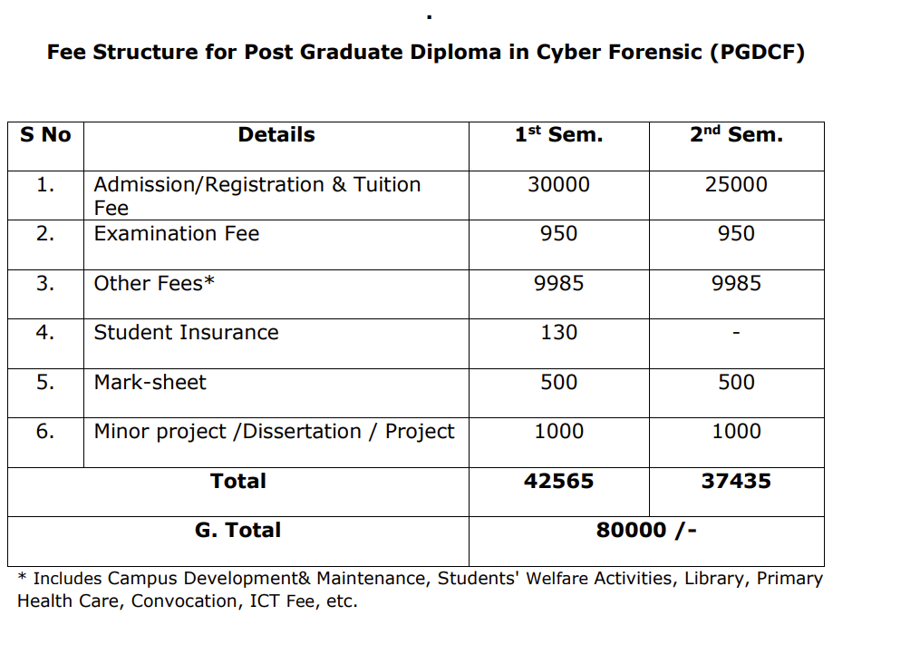 CU Jammu PG Diploma Cyber Forensics fees 2025 is ₹ 80,000 for the entire course duration.