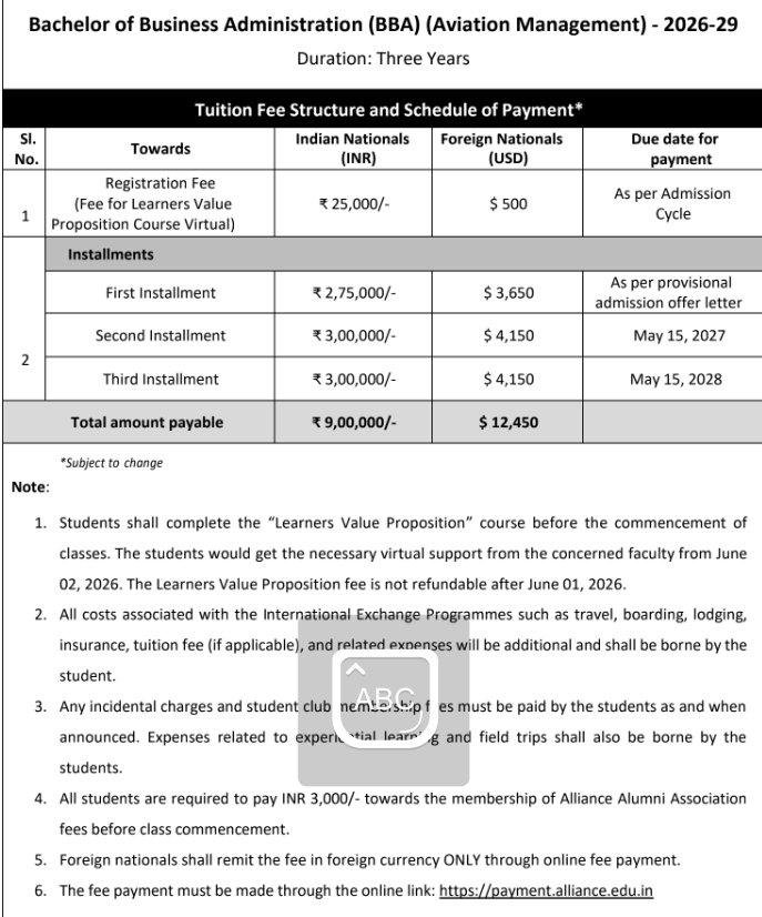BBA Aviation Fees at Alliance University Bangalore covers a range of expenses, including tuition fee, course materials, and access to campus facilities.