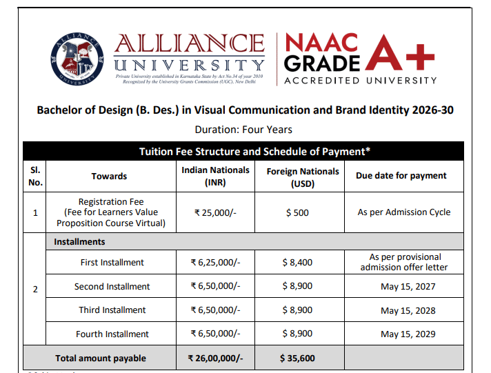 Earlier, B.Des Visual Communication fees at Alliance University Bangalore was ₹ 14 Lakhs (in 2025) for the entire course duration. This shows a fee increase of ₹ 2 Lakhs over the year.