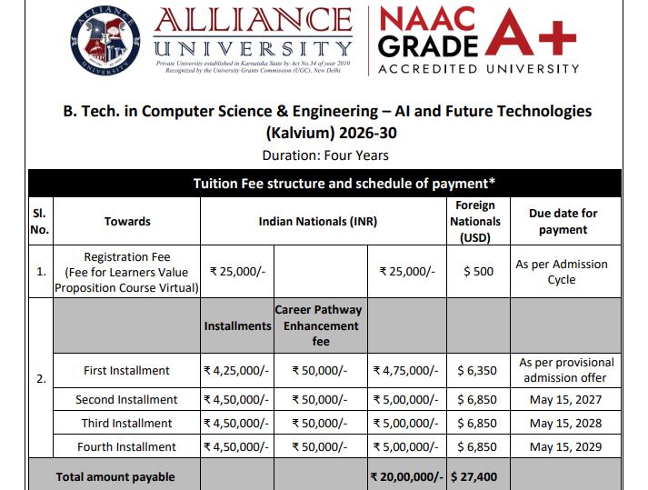 Earlier, B.Tech AI and Future Technologies fees at Alliance University Bangalore was ₹ 20 Lakhs (in 2025) for the entire course duration. This shows that the fee has remained unchanged since 2025.