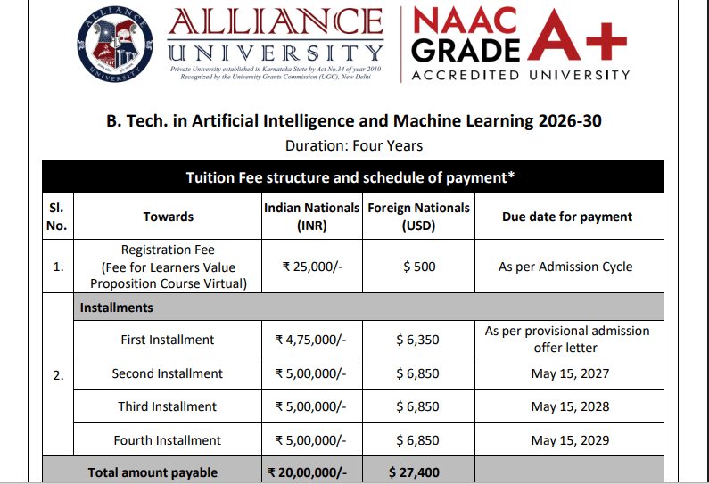 Earlier, B.Tech Artificial Intelligence & Machine Learning fees at Alliance University Bangalore was ₹ 20 Lakhs (in 2025) for the entire course duration. This shows that the fee has remained unchanged since 2025.