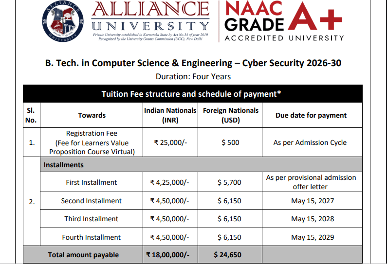 Earlier, B.Tech Cyber Security fees at Alliance University Bangalore was ₹ 18 Lakhs (in 2025) for the entire course duration. This shows that the fee has remained unchanged since 2025.
