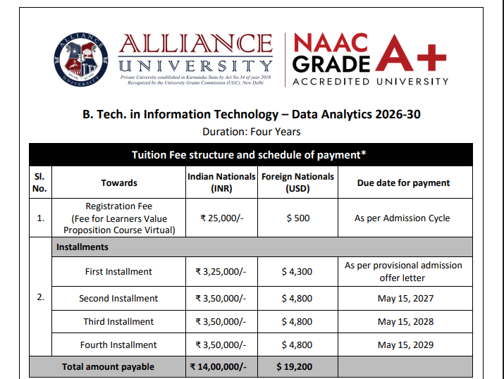 Earlier, B.Tech Data Analytics fees at Alliance University Bangalore was ₹ 14 Lakhs (in 2025) for the entire course duration. This shows that the fee has remained unchanged since 2025.