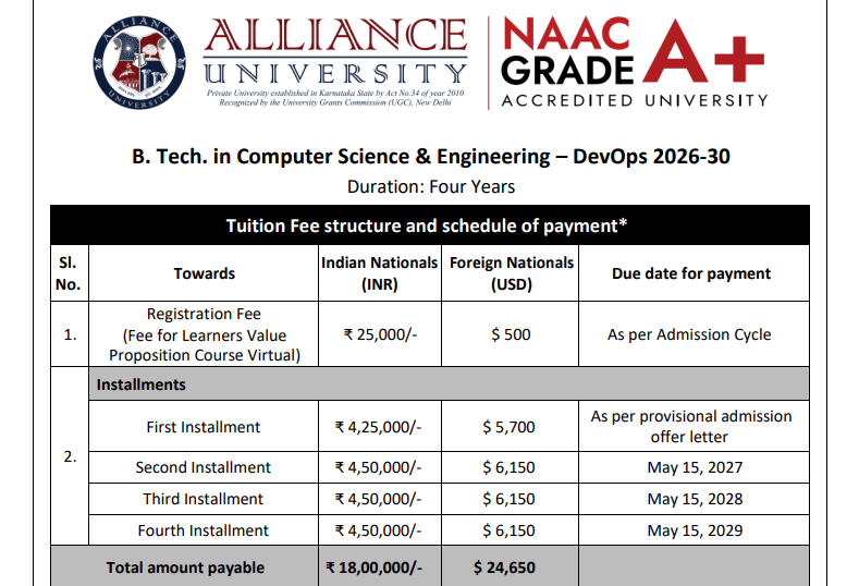 Earlier, B.Tech DevOps fees at Alliance University Bangalore was ₹ 18 Lakhs (in 2025) for the entire course duration. This shows that the fee has remained unchanged since 2025.