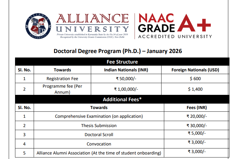 Ph.D Economics Fees at Alliance University Bangalore covers a range of expenses, including tuition fee, course materials, and access to campus facilities.