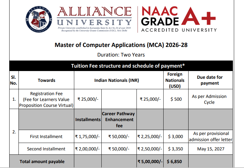 Earlier, MCA Data Science fees at Alliance University Bangalore was ₹ 5 Lakhs (in 2025) for the entire course duration. This shows that the fee has remained unchanged since 2025.