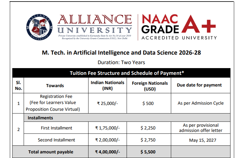 Earlier, M.Tech Artificial Intelligence & Data Science fees at Alliance University Bangalore was ₹ 4 Lakhs (in 2025) for the entire course duration. This shows that the fee has remained unchanged since 2025.