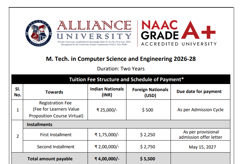 Earlier, M.Tech Computer Science And Engineering fees at Alliance University Bangalore was ₹ 4 Lakhs (in 2025) for the entire course duration. This shows that the fee has remained unchanged since 2025.