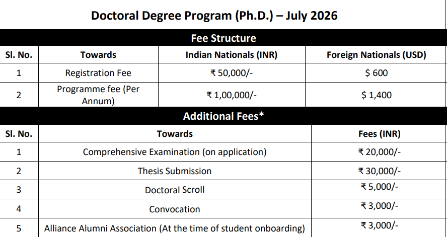 Ph.D Liberal Arts Fees at Alliance University Bangalore covers a range of expenses, including tuition fee, course materials, and access to campus facilities.