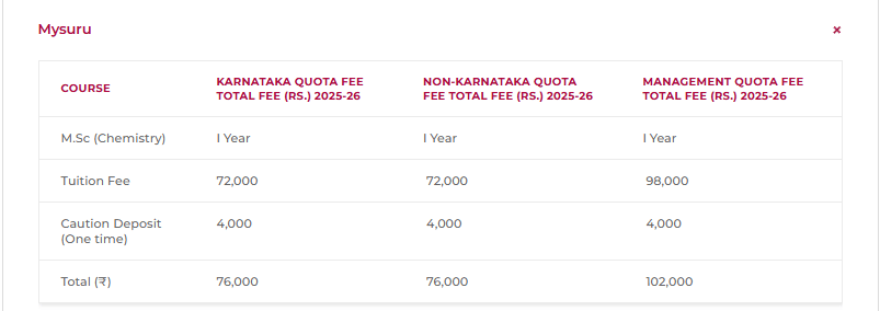 Earlier, M.Sc Chemistry fees at Amrita Vishwa Vidyapeetham Mysore Campus was ₹ 1.6 Lakhs (in 2025) for the entire course duration. This shows that the fee has remained unchanged since 2025.