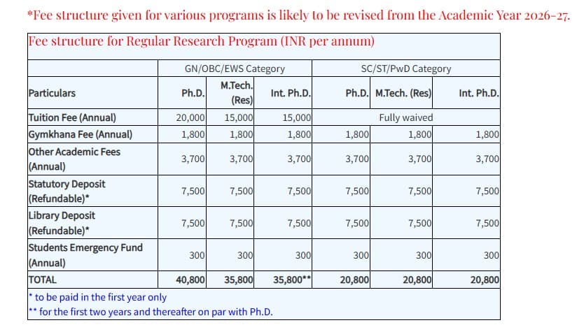 The campus supports internships and project work for students from any institute, with project assistant positions available. M.Sc. Life Science students pay annual fees of approximately 29,000 INR for General, OBC, and EWS categories, and 20,000 INR for SC/ST categories. The program does not provide direct financial assistance, but students with scholarships, such as the Aspire scholarship, may benefit. Additionally, master's students receive a 16,000 INR stipend, with 37,000 INR for JRF and 42,000 INR for SRF during Ph.D.