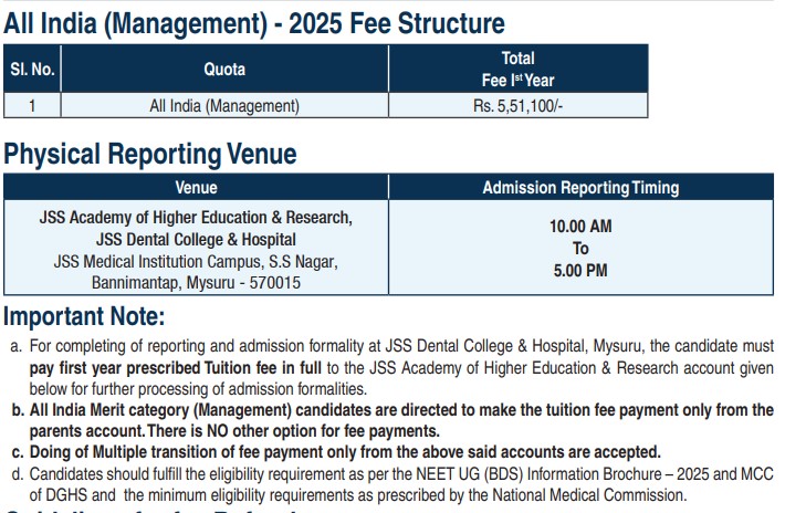 JSS Academy of Higher Education & Research Mysore BDS is offered as 4 Years Full Time program, with total intake of 100 seats. The minimum eligibility criteria for BDS is 10+2 + NEET UG. The total fees for JSS Academy of Higher Education & Research Mysore BDS in 2025 is ₹ 22.04 Lakhs for the complete course duration, which includes total tuition fees of ₹ 22.04 Lakhs.